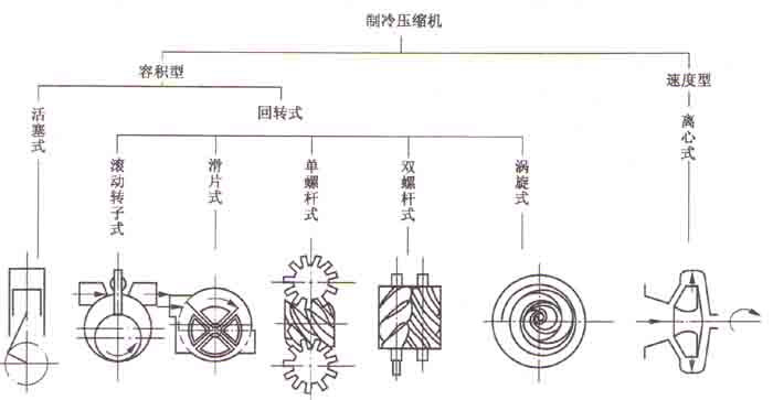 制冷壓縮機的種類有:轉(zhuǎn)子式壓縮機,離心式壓縮機,活塞式壓縮機、渦旋式壓縮機、螺桿式壓縮機等。
