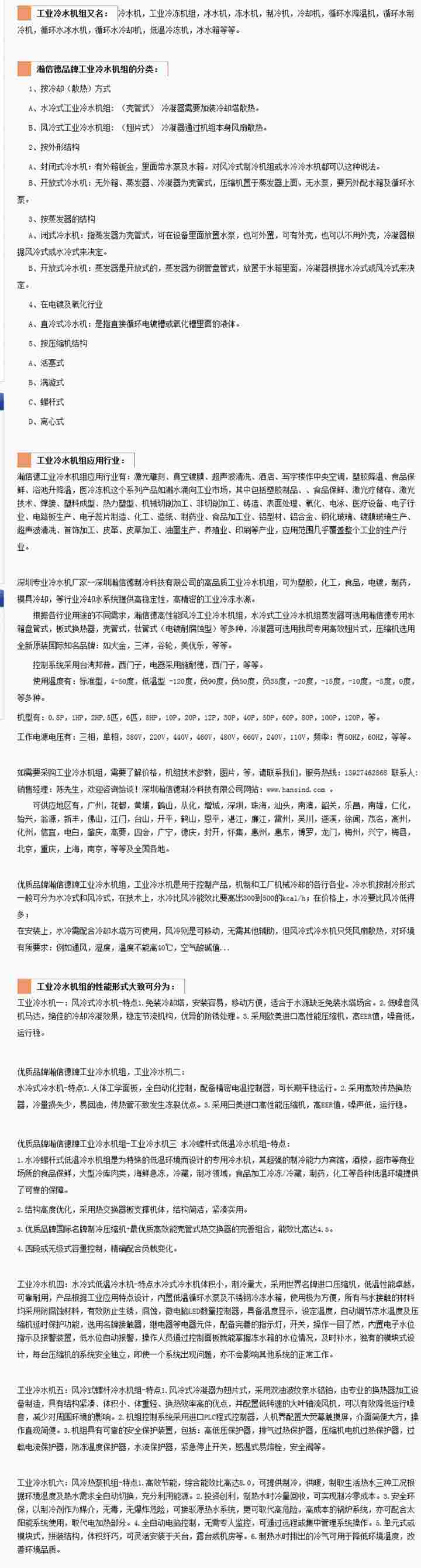 本主著重介紹【瀚信德工業(yè)冷水機(jī)組的別名分類與應(yīng)用行業(yè)】,通過這篇文章朋友們會(huì)對(duì)瀚信德工業(yè)冷水機(jī)組有個(gè)比較系統(tǒng)的了解,從工業(yè)冷水機(jī)的包裝形式,到各種款式的性能特點(diǎn),大家習(xí)慣的別名,標(biāo)準(zhǔn)和非標(biāo)機(jī)的電壓,頻率,瀚信德工業(yè)冷水機(jī)組最常采用的配置,都詳細(xì)做了介紹,詳情請(qǐng)看下面。