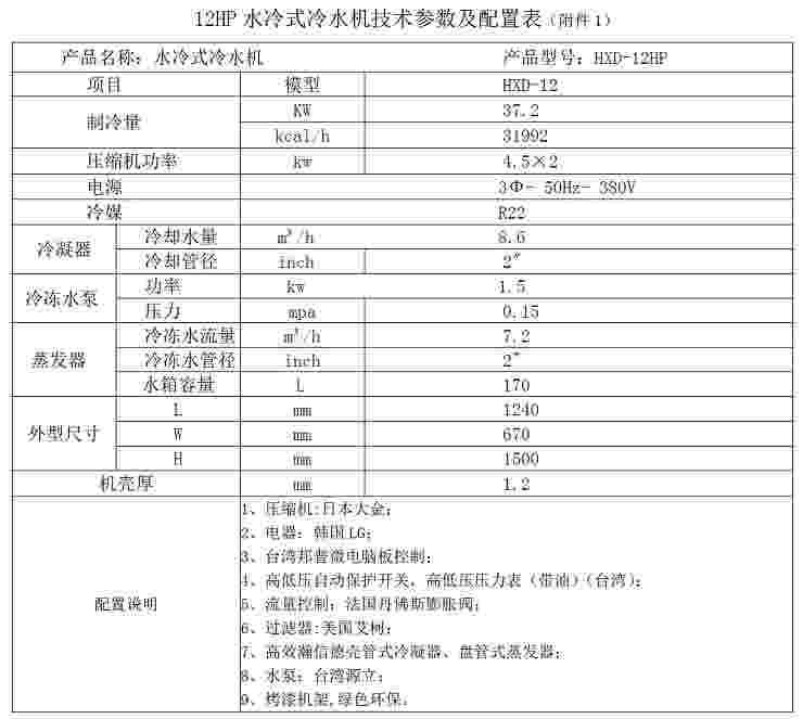 深圳瀚信德制冷生產(chǎn),銷(xiāo)售的水冷式注塑機(jī)專(zhuān)用冷水機(jī)組品質(zhì)優(yōu),外形美觀(guān),價(jià)格優(yōu)惠,廠(chǎng)家直銷(xiāo)讓使用廠(chǎng)家得到更多的實(shí)惠,還有個(gè)更大的好處就是方便提供快速準(zhǔn)確的技術(shù)支持,而一般的銷(xiāo)售商沒(méi)有太多的技術(shù)知識(shí),12HP水冷式注塑機(jī)專(zhuān)用冷水機(jī)價(jià)格,含稅不含運(yùn)費(fèi)23800元一臺(tái),技術(shù)參數(shù)與配置如下所示!